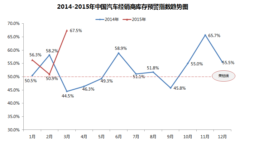 中國汽車流通協(xié)會發(fā)布的“中國汽車經(jīng)銷商庫存預警指數(shù)調(diào)查”VIA(Vehicle Inventory Alert Index)顯示,2015年3月庫存預警指數(shù)為67.5%,比上月上升了16.6個百分點。處于警戒線水平以上。