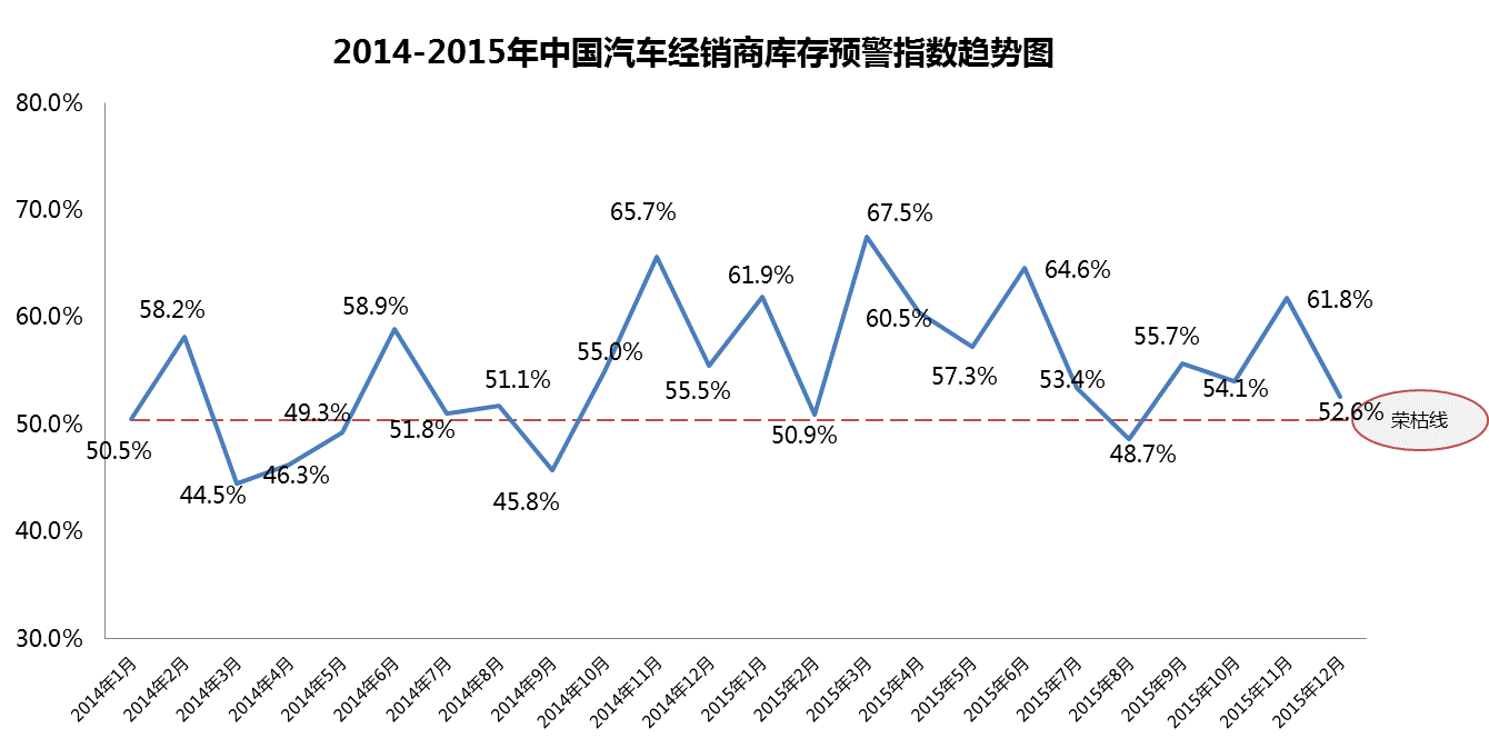 中國(guó)汽車流通協(xié)會(huì)發(fā)布的“中國(guó)汽車經(jīng)銷商庫(kù)存預(yù)警指數(shù)調(diào)查”VIA(Vehicle Inventory Alert Index)顯示,2015年12月庫(kù)存預(yù)警指數(shù)為52.6%,比上月下降了9.2個(gè)百分點(diǎn)。庫(kù)存預(yù)警指數(shù)處于警戒線以上。