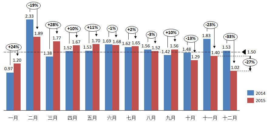2015年12月份經(jīng)銷商庫存系數(shù)為1.02