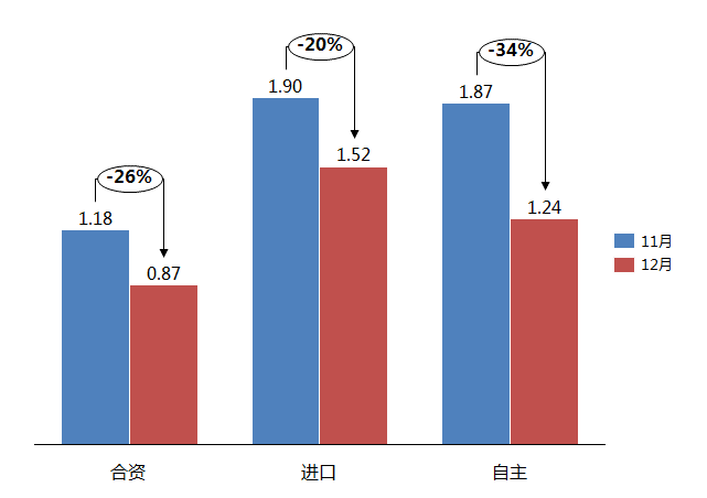 12月份,合資、進(jìn)口、自主品牌庫存系數(shù)均有下降,合資品牌庫存系數(shù)由上月1.18降至0.87,環(huán)比下降26%;進(jìn)口品牌的庫存系數(shù)由上月的1.90降至1.52,環(huán)比下降20%;自主品牌庫存系數(shù)由上月的1.87降至1.24,環(huán)比下降34%;合資、進(jìn)口、自主品牌經(jīng)銷商的庫存壓力均有不同程度的減小。