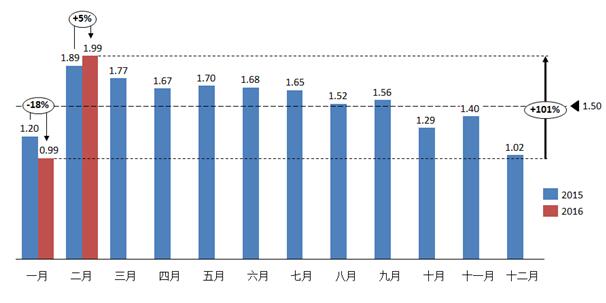 2016年2月份經(jīng)銷(xiāo)商庫(kù)存系數(shù)為1.99