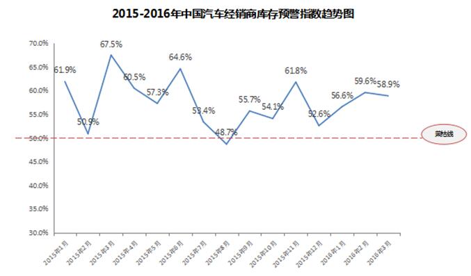 2016年3月份中國汽車經(jīng)銷商庫存預(yù)警指數(shù)為58.9%