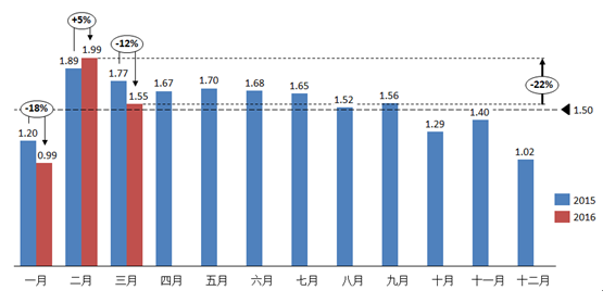 2016年3月份經(jīng)銷商庫存系數(shù)為1.55
