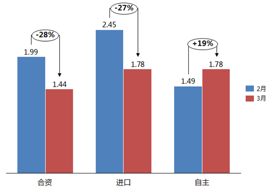 3月份,合資、進(jìn)口品牌庫存系數(shù)均有不同程度的下降,自主品牌的庫存系數(shù)上升。合資品牌庫存系數(shù)由上月1.99降至1.44,環(huán)比下降28%;進(jìn)口品牌的庫存系數(shù)由上月的2.4降至1.78,環(huán)比下降27%;自主品牌庫存系數(shù)由上月的1.49升至1.78,環(huán)比上升19%;合資庫存水平處于預(yù)警線以下,進(jìn)口品牌和自主品牌的庫存系數(shù)處于預(yù)警線以上。1-2月份自主品牌經(jīng)銷商的銷售量大于進(jìn)貨量,經(jīng)銷商庫存壓力不大。3月份廠家補(bǔ)充庫存,庫存量有所增加,庫存壓力有所上升。