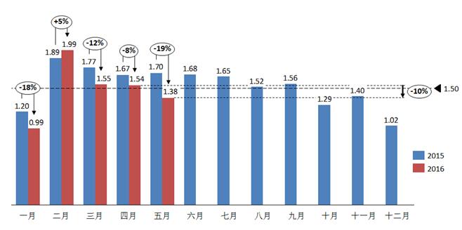 2016年5月份經(jīng)銷商庫存系數(shù)為1.38