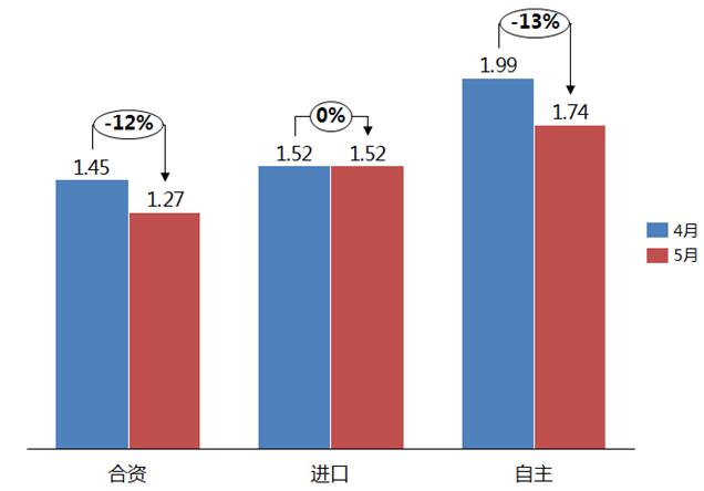 5月份,合資品牌、自主品牌庫存系數(shù)相比上月有所下降,進(jìn)口品牌庫存系數(shù)與上月持平。合資品牌庫存系數(shù)為1.27,環(huán)比下降12%,在警戒線以下。進(jìn)口品牌庫存系數(shù)為1.52,與上月相同。自主品牌庫存系數(shù)為1.74,同比下降13%,庫存水平依然高于警戒線。5月,合資品牌開始在SUV市場進(jìn)行反擊,加大促銷力度,新車型以及換代車型也開始進(jìn)入市場,對(duì)自主品牌形成較大沖擊,自主品牌經(jīng)銷商庫存壓力依然較大。