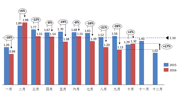 圖1 2015-2016年月度汽車經(jīng)銷商庫存系數(shù)