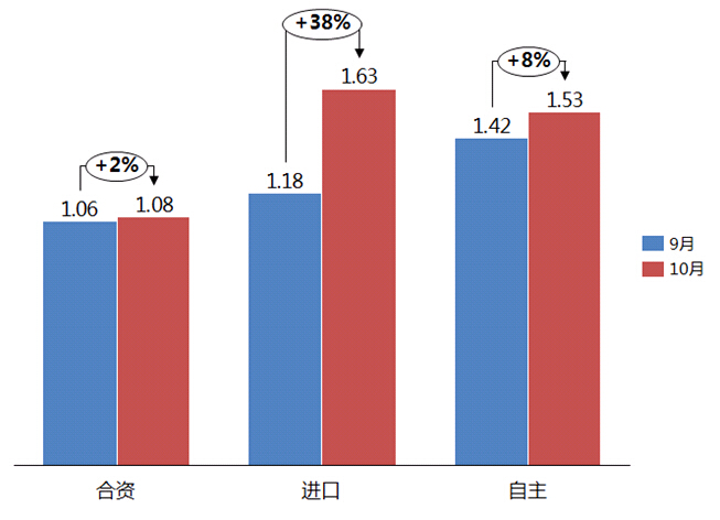 10月份,合資品牌、進口品牌和自主品牌庫存系數(shù)相比上月均有所上升,合資品牌庫存水平位于警戒線以下,進口品牌和自主品牌庫存水平位于警戒線以上。合資品牌庫存系數(shù)為1.08,環(huán)比上升2%。進口品牌庫存系數(shù)為1.63,環(huán)比上升38%。自主品牌庫存系數(shù)為1.53,環(huán)比上升8%。