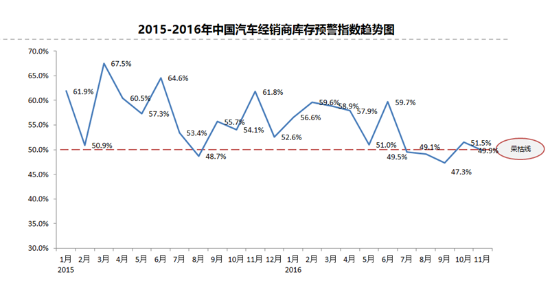 2016年11月份中國汽車經銷商庫存預警指數(shù)為49.9%
