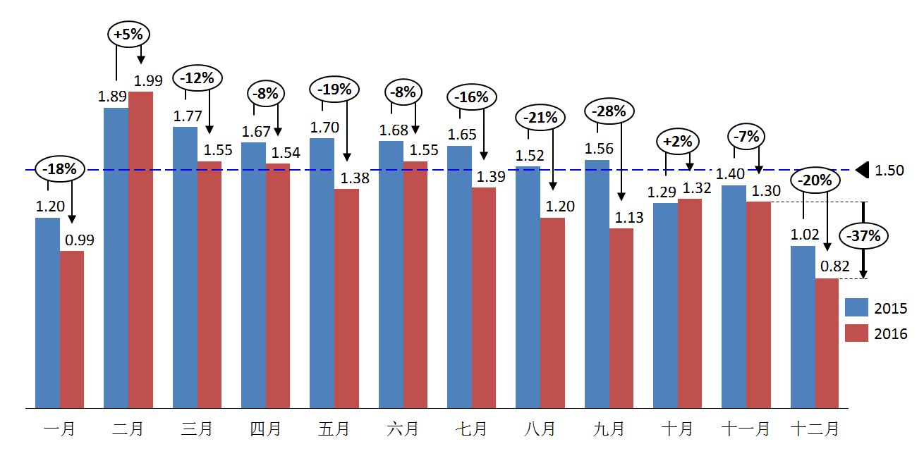 2016年12月份經(jīng)銷商庫(kù)存系數(shù)為0.82