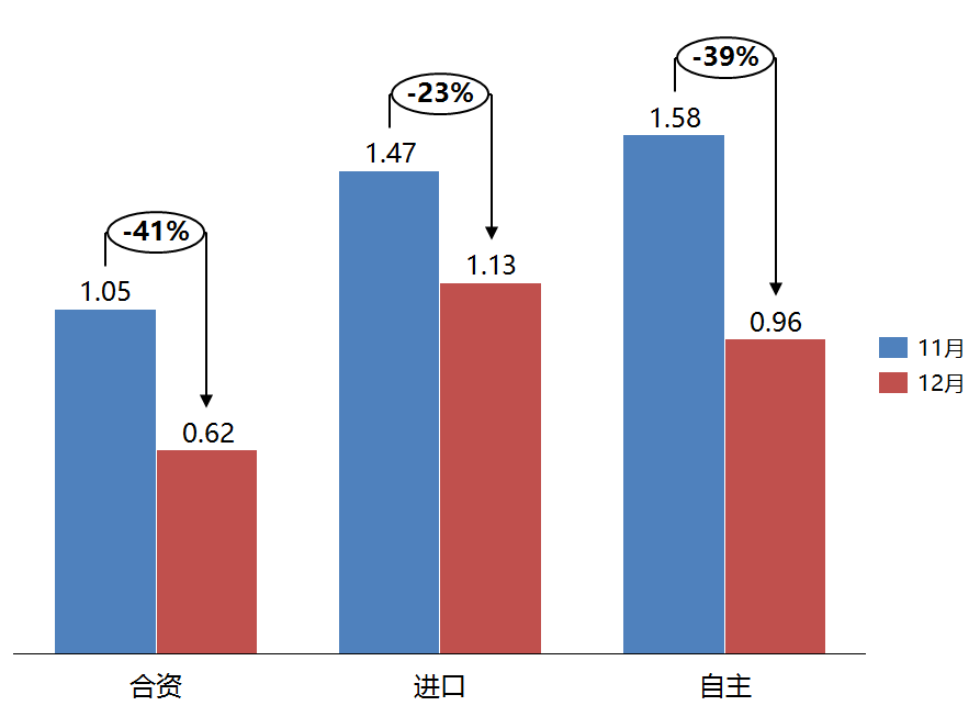 12月份,合資品牌、進(jìn)口品牌和自主品牌的庫(kù)存系數(shù)相比上月均有所下降。合資品牌庫(kù)存系數(shù)為0.62,環(huán)比下降41%,合資品牌庫(kù)存系數(shù)已位于0.8~1.2的合理區(qū)之下,建議經(jīng)銷商可以合理補(bǔ)充庫(kù)存,避免因庫(kù)存過(guò)低導(dǎo)致消費(fèi)者不能及時(shí)提車;進(jìn)口品牌庫(kù)存系數(shù)為1.13,環(huán)比下降23%,進(jìn)口品牌經(jīng)銷商庫(kù)存水平回落至合理區(qū)間;自主品牌庫(kù)存系數(shù)為0.96,環(huán)比下降39%,自主品牌經(jīng)銷商庫(kù)存水平回落至合理區(qū)間。