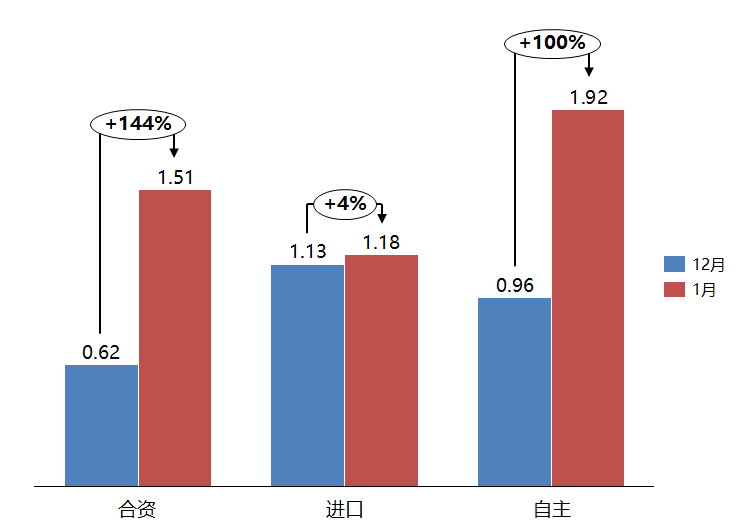 1月份,合資品牌、進(jìn)口品牌和自主品牌的庫存系數(shù)相比上月均有所上升。合資品牌庫存系數(shù)為1.51,環(huán)比上升144%;進(jìn)口品牌庫存系數(shù)為1.18,環(huán)比上升4%;自主品牌庫存系數(shù)為1.92,環(huán)比上升100%。1月,合資品牌和自主品牌均位于警戒線以上。