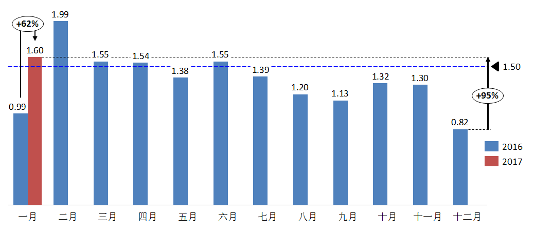 2017年1月份經(jīng)銷商庫存系數(shù)為1.60