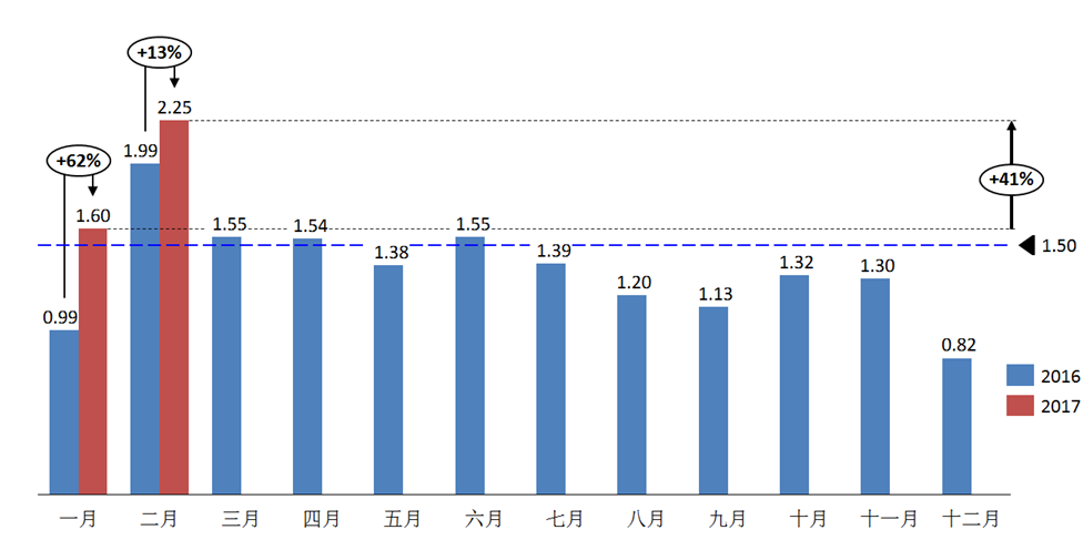 2017年2月份經(jīng)銷商庫存系數(shù)為2.25
