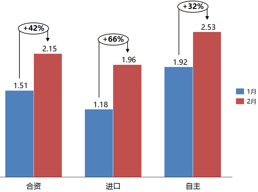 2月份,合資品牌、進口品牌和自主品牌的庫存系數(shù)相比上月均有所上升。合資品牌庫存系數(shù)為2.15,環(huán)比上升42%;進口品牌庫存系數(shù)為1.96,環(huán)比上升66%;自主品牌庫存系數(shù)為2.53,環(huán)比上升32%。2月,合資品牌、進口品牌和自主品牌庫存水平均位于警戒線以上。