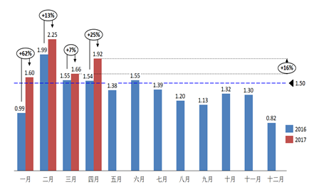 2017年4月汽車經(jīng)銷商庫存系數(shù)為1.92