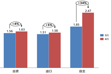 4月份,合資品牌、進口品牌和自主品牌的庫存系數(shù)相比上月均有所上升。合資品牌庫存系數(shù)為1.63,環(huán)比上升4%;進口品牌庫存系數(shù)為1.58,環(huán)比上升5%;自主品牌庫存系數(shù)為2.47,環(huán)比上升34%。4月,合資品牌、進口品牌和自主品牌庫存水平均位于警戒線以上。