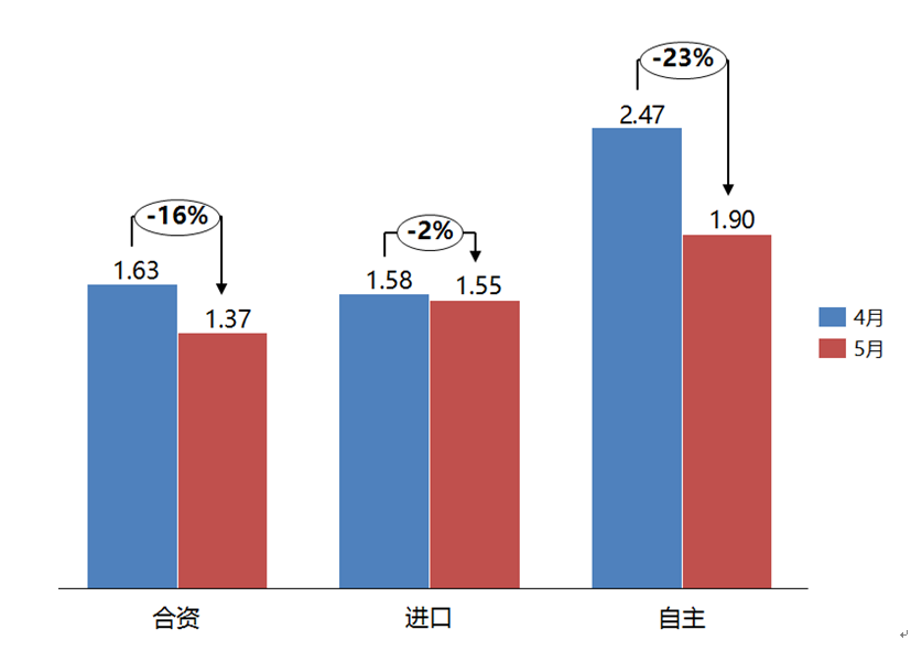 5月份,合資品牌、進口品牌和自主品牌的庫存系數(shù)相比上月均有所下降。合資品牌庫存系數(shù)為1.37,環(huán)比下降16%;進口品牌庫存系數(shù)為1.55,環(huán)比下降2%;自主品牌庫存系數(shù)為1.90,環(huán)比下降23%。5月,進口品牌和自主品牌庫存水平位于警戒線以上。