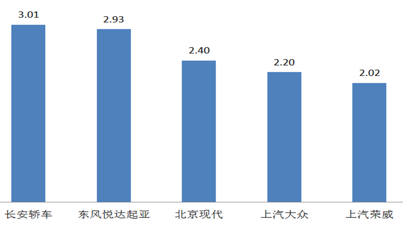 5月,5個品牌庫存深度在兩個月以上,分別是:長安轎車、東風悅達起亞、北京現(xiàn)代、上汽大眾、上汽榮威。