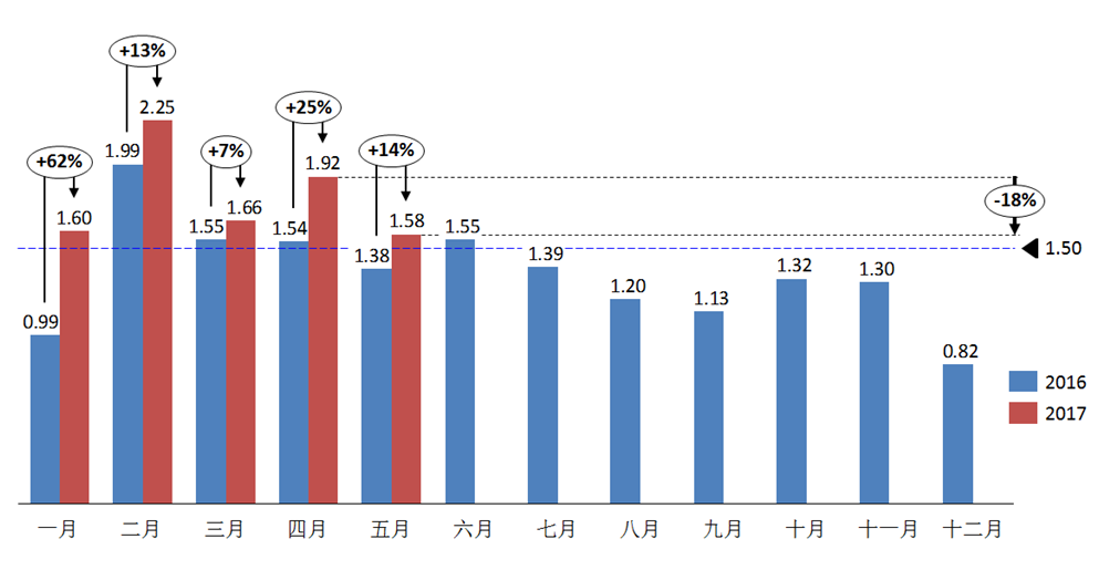 2017年6月18日,中國汽車流通協(xié)會對外發(fā)布2017年5月份“汽車經(jīng)銷商庫存調(diào)查結(jié)果”。5月份汽車經(jīng)銷商綜合庫存系數(shù)為1.58, 同比上升14%,環(huán)比下降18%,經(jīng)銷商庫存水平有所回落,但依然位于警戒線以上。