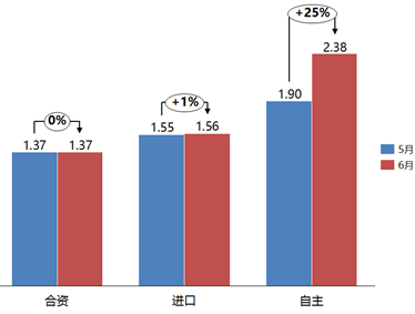 6月份,合資品牌庫存系數(shù)與上月持平、進(jìn)口品牌和自主品牌庫存系數(shù)相比上月上升。合資品牌庫存系數(shù)為1.37,與上月持平;進(jìn)口品牌庫存系數(shù)為1.56,環(huán)比上升1%;自主品牌庫存系數(shù)為2.38,環(huán)比上升25%。6月,進(jìn)口品牌和自主品牌庫存水平位于警戒線以上。