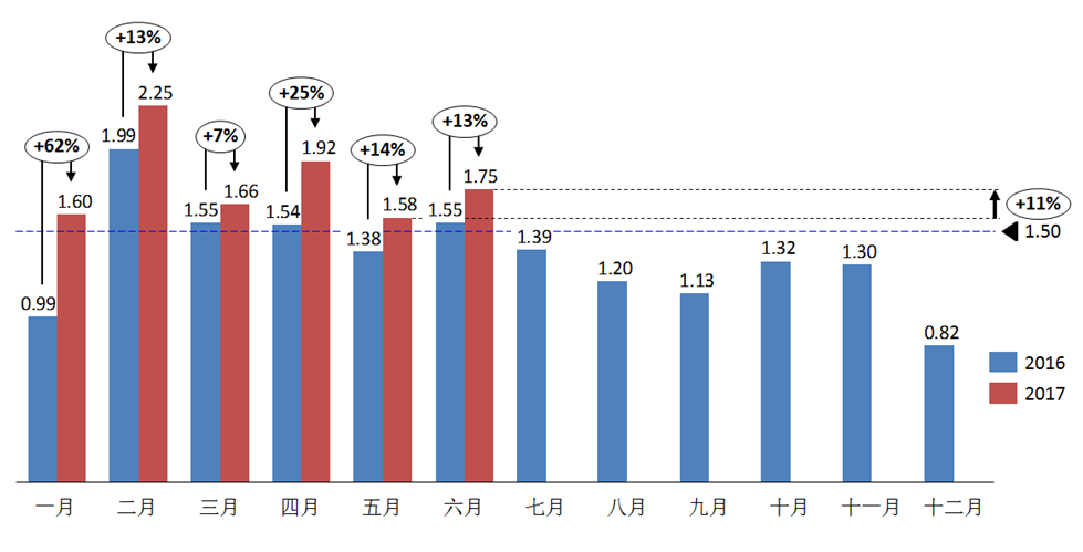 2017年6月汽車經(jīng)銷商庫存系數(shù)為1.75