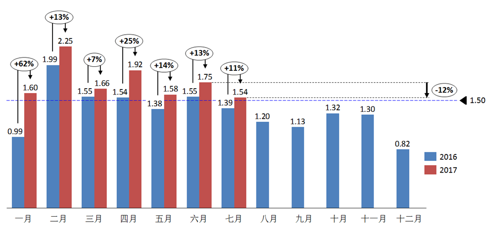 2017年8月10日,中國汽車流通協(xié)會對外發(fā)布2017年7月份“汽車經銷商庫存調查結果”。7月份汽車經銷商綜合庫存系數為1.54, 同比上升11%,環(huán)比下降12%,庫存水平位于警戒線以上。