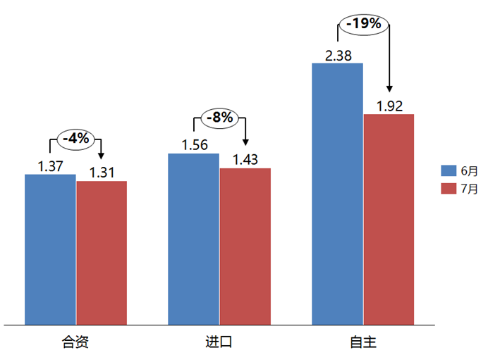7月份,合資品牌、進口品牌和自主品牌庫存系數相比上月下降。合資品牌庫存系數為1.31,環(huán)比下降4%;進口品牌庫存系數為1.43,環(huán)比下降8%;自主品牌庫存系數為1.92,環(huán)比下降19%。7月,自主品牌庫存水平依然位于警戒線以上。