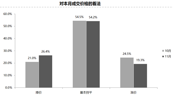 調(diào)查結(jié)果顯示,認(rèn)為成交價(jià)格下降的經(jīng)銷商比例為26.4%;認(rèn)為漲價(jià)的比例為19.3%;認(rèn)為成交價(jià)格與上月基本持平的比例為54.2%。