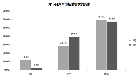 預(yù)計(jì)12月份市場(chǎng)需求比11月增加,認(rèn)為市場(chǎng)需求“增加”的經(jīng)銷商比例為57.5%;認(rèn)為市場(chǎng)需求“減少”的比例為2.8%;認(rèn)為市場(chǎng)需求“持平”的比例為39.6%。