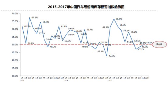 2017年11月份中國(guó)汽車經(jīng)銷商庫(kù)存預(yù)警指數(shù)為49.8%