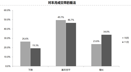 調(diào)查結(jié)果顯示,認(rèn)為成交率增長(zhǎng)的比例為34%;認(rèn)為下降的比例為19.3%;認(rèn)為基本持平的比例為46.7%