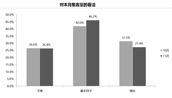 11月份集客量跟上月基本持平,認(rèn)為11月份集客量下降的經(jīng)銷商比例為26.4%;認(rèn)為增長(zhǎng)的比例為27.4%;認(rèn)為集客量基本持平的比例為46.2%。