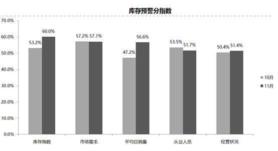 從分指數(shù)情況看:11月份庫(kù)存分指數(shù)和平均日銷量分指數(shù)相比上月大幅上升;市場(chǎng)需求分指數(shù)與上月基本持平;從業(yè)人員分指數(shù)相比上月下降,經(jīng)營(yíng)狀況分指數(shù)相比上月略微上升。