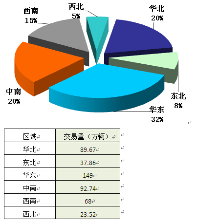 據(jù)中國(guó)汽車流通協(xié)會(huì)全口徑統(tǒng)計(jì), 2015年上半年二手車市場(chǎng)區(qū)域特性表現(xiàn)明顯,區(qū)域經(jīng)濟(jì)較發(fā)達(dá)、汽車保有量較大的華東地區(qū)交易量占32%,其次是華北地區(qū)集中了20%的交易量。