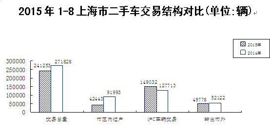 今年1-8月,全市累計(jì)二手車交易量為241253輛,同比下降11.25%。從交易流向看,市區(qū)內(nèi)過(guò)戶交易量為42443輛,同比下降53.86%;滬C號(hào)牌二手車交易量為149032輛,同比增長(zhǎng)16.69%(其中新增滬C號(hào)牌二手車交易量為73424輛,同比增長(zhǎng)19.29%);轉(zhuǎn)出市外交易量為49778輛,同比下降4.50%。