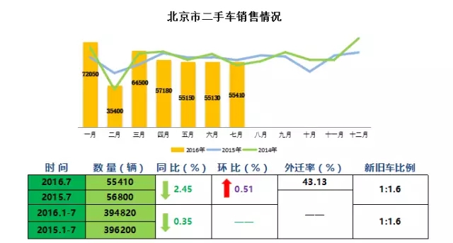 數(shù)據(jù)顯示,7月份京城二手車成交過戶55410輛,同比下降2.45%,環(huán)比增長0.51%;1-7月京城二手車?yán)塾嫵山贿^戶394820輛次,同比 去年396200輛次累計下降0.35%;二手車超新車銷量60.42%,新舊車交易比例1:1.6。北辰亞市信息企劃部部長郭詠在分析京城二手車銷售情 況時表示,解除限遷對北京二手車市場整體交易遲滯作用依然明顯。
