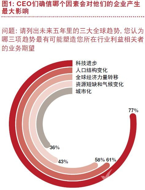 當(dāng)被問及在未來五年里,什么因素最有可能塑造行業(yè)利益相關(guān)者的業(yè)務(wù)期望時,CEO們明確表態(tài),指出“科技進(jìn)步”是目前最有影響力的因素。這樣的開頭就引出一個新的問題, CEO們將如何應(yīng)對“科技進(jìn)步”沖擊,將沖擊化作力量,形成壁壘?