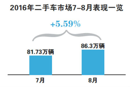 統(tǒng)計數(shù)據(jù)顯示,8月,全國二手車市場交易量達(dá)86.3萬輛,環(huán)比增長5.59%,同比增長15.3%。交易額為498.97億元,環(huán)比下降6.75%。截至8月,2016年全國二手車?yán)塾嫿灰琢繛?49.9萬輛,累計同比增長6.53%。 沈榮表示,8月能夠重新回到86萬輛新的水平基礎(chǔ),不能不說是市場信心的回歸。 “9月是二手車市場的交易旺季,隨著各地陸續(xù)放開限遷政策,加上‘十一’假期的節(jié)日效應(yīng),二手車市場需求呈現(xiàn)增長態(tài)勢,在一定程度上促進(jìn)了9月的市場交易。”沈榮說。