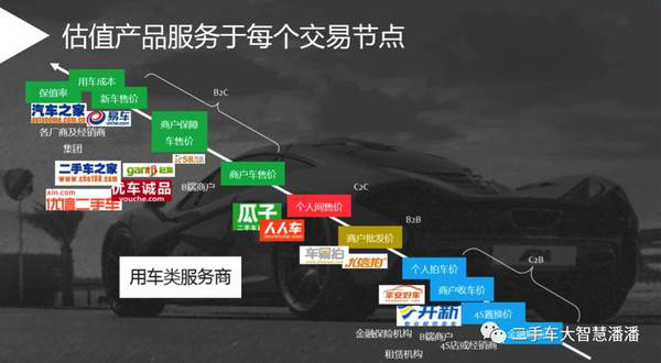 13年的時候,筆者在知乎上寫過一篇文章,大概闡述了二手車行業(yè)價值鏈中所產(chǎn)生的服務(wù)價值點,每個價值鏈的節(jié)點都是交易,那么估值的產(chǎn)品服務(wù)應(yīng)該是所有交易的節(jié)點。