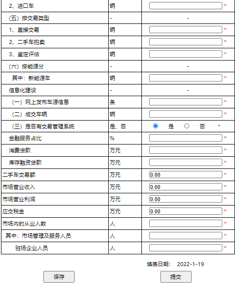 填報(bào)方式:“汽車流通信息統(tǒng)計(jì)報(bào)送系統(tǒng)”網(wǎng)址:http://www.cacm.com.cn/cada/Login.asp,輸入企業(yè)全稱(或企業(yè)賬號(hào))、密碼登錄進(jìn)入,點(diǎn)擊左側(cè)“交易市場(chǎng)情況統(tǒng)計(jì)(年報(bào))”,按要求準(zhǔn)確填報(bào)二手車交易市場(chǎng)情況統(tǒng)計(jì)表(2021年統(tǒng)計(jì)年報(bào)),點(diǎn)擊“保存”、“提交”,完成填報(bào),同時(shí)在系統(tǒng)內(nèi)完善企業(yè)信息填寫,包括統(tǒng)計(jì)工作負(fù)責(zé)人相關(guān)信息更新。年報(bào)工作請(qǐng)于2022年4月15日前完成填報(bào)與審核。