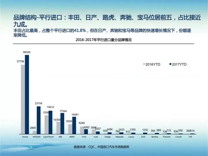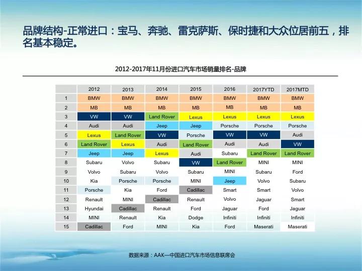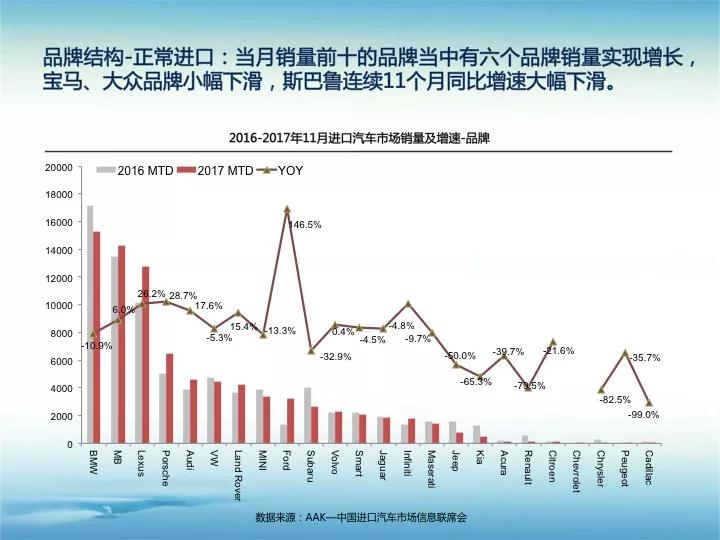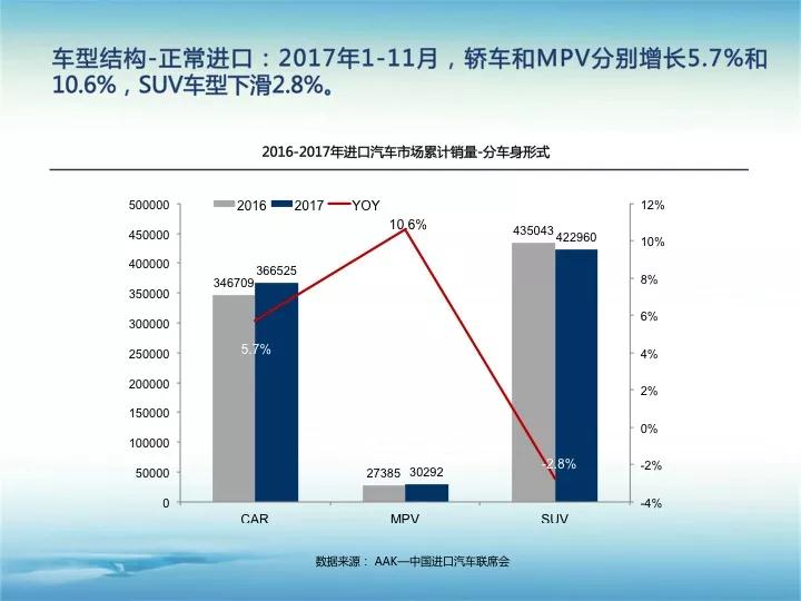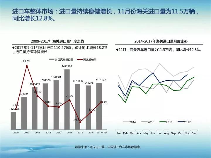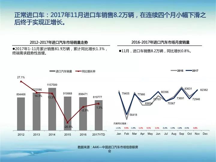 導(dǎo)讀:2017年1-11月累計(jì)進(jìn)口110.2萬(wàn)輛,累計(jì)同比增長(zhǎng)18.2%,進(jìn)口量持續(xù)穩(wěn)健增長(zhǎng)。2017年1-11月累計(jì)銷(xiāo)售81.9萬(wàn)輛,累計(jì)同比增長(zhǎng)1.3%,終端需求趨勢(shì)性放緩。