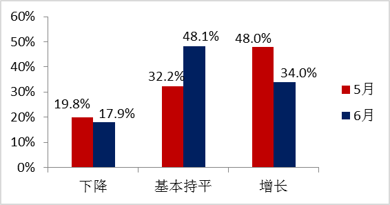 6月,庫(kù)存指數(shù)為54.0%,環(huán)比下降5.3個(gè)百分點(diǎn)。調(diào)查顯示:經(jīng)銷(xiāo)商認(rèn)為庫(kù)存量“增長(zhǎng)”的比例從48.0%降至33.9%;“基本持平”的比例從32.2%升至48.1%;認(rèn)為“下降”的比例從19.8%降至17.9%。