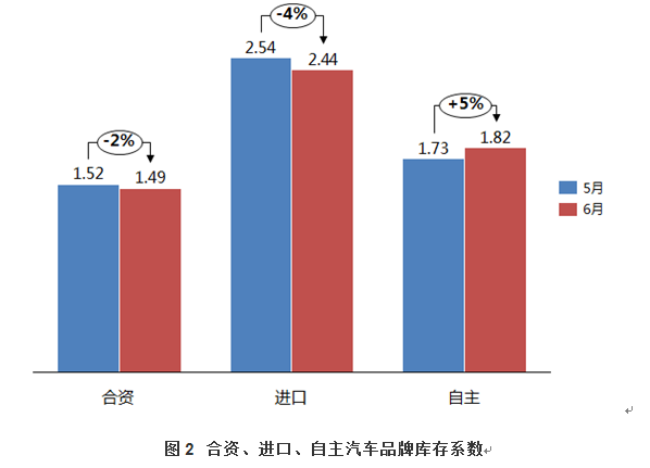 6月份,合資、進(jìn)口品牌庫存系數(shù)均有下降,合資品牌庫存系數(shù)由上月1.52降至1.49,環(huán)比下降2%;進(jìn)口品牌的庫存系數(shù)由上月的2.54降至2.44,環(huán)比下降4%;自主品牌庫存系數(shù)由上月的1.73升至1.82,環(huán)比上升5%;合資、進(jìn)口品牌經(jīng)銷商在通過降價(jià)穩(wěn)定銷量,但市場需求不旺,消費(fèi)者購車熱情和資金能力下降,銷量情況并不樂觀,廠家和經(jīng)銷商積極控制庫存,提車量下降,在一定程度上緩解庫存壓力。