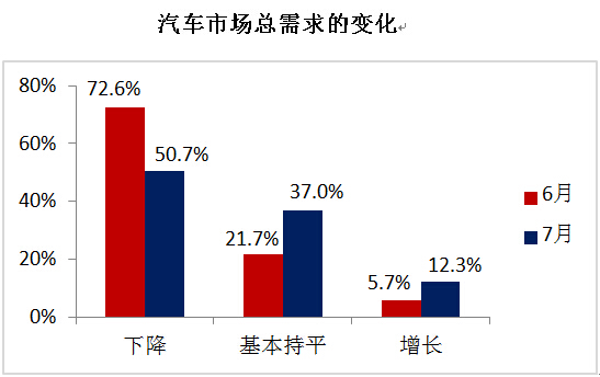 調(diào)查顯示,7月份市場(chǎng)總需求上升,平均日銷量有所增加,從業(yè)人員略有增加,經(jīng)銷商經(jīng)營(yíng)狀況相比上月略好。6月份,汽車市場(chǎng)處于淡季,經(jīng)濟(jì)下滑、天氣炎熱導(dǎo)致需求不旺,消費(fèi)者購車意愿不強(qiáng),經(jīng)銷商集客量及成交率不高,導(dǎo)致汽車流通行業(yè)景氣度降低。但7月份,需求略有回升。部分廠家商務(wù)政策不明朗的情況下,經(jīng)銷商提車量下降,庫存壓力有所緩解。