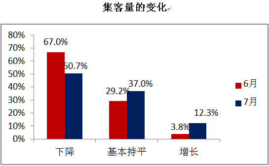 7月份集客量相比上月有所增加,認(rèn)為集客量下降的經(jīng)銷商比例由上月的67.0%降至50.7%;認(rèn)為增長(zhǎng)的比例由3.8%升至12.3%;認(rèn)為基本持平的比例由29.2%升至37.0%。7月份,經(jīng)銷商促銷活動(dòng)增加,集客量增加。