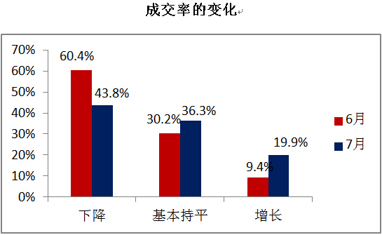 7月份,認(rèn)為成交率下降比例由上月的60.4%降至43.8%,認(rèn)為增長(zhǎng)的比例由9.4%升至19.9%,認(rèn)為基本持平的比例由30.2%升至36.3%。相比6月份來說,4S店內(nèi)成交率上升,主要因?yàn)槭袌?chǎng)需求增加,4S店集客量增加。