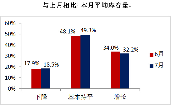 7月,庫存指數(shù)為47.5%,環(huán)比下降6.5個(gè)百分點(diǎn)。調(diào)查顯示:經(jīng)銷商認(rèn)為庫存量“增長(zhǎng)”的比例從33.9%降至32.2%;“基本持平”的比例從48.1%升至49.3%;認(rèn)為“下降”的比例從17.9%升至18.5%。7月份為下半年第一個(gè)月,廠家對(duì)經(jīng)銷商的提車量要求較松,經(jīng)銷商庫存壓力有所緩解。