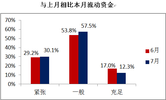 7月份,經(jīng)銷商流動(dòng)資金狀況一般。認(rèn)為流動(dòng)資金“一般”的企業(yè)從53.8%升至57.5%;流動(dòng)資金“充足”的比例從上月的17.0%降至12.3%;經(jīng)營(yíng)狀況“緊張”的比例從上月的29.2%升至30.1%。