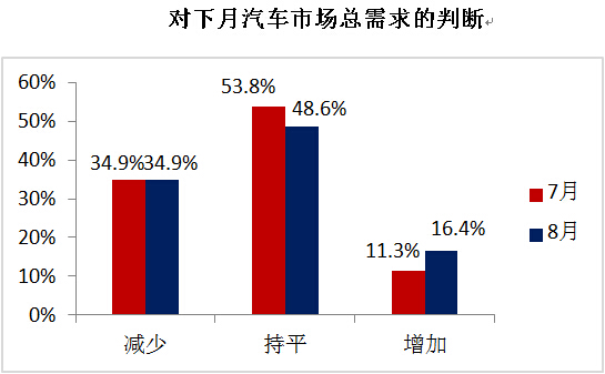 8月份,市場(chǎng)總需求相比上月略有上升。認(rèn)為市場(chǎng)需求“增加”的經(jīng)銷商比例由11.3%升至16.4%;認(rèn)為市場(chǎng)需求“下降”的比例與上月持平;認(rèn)為基本持平的比例由53.8%降至48.6%。